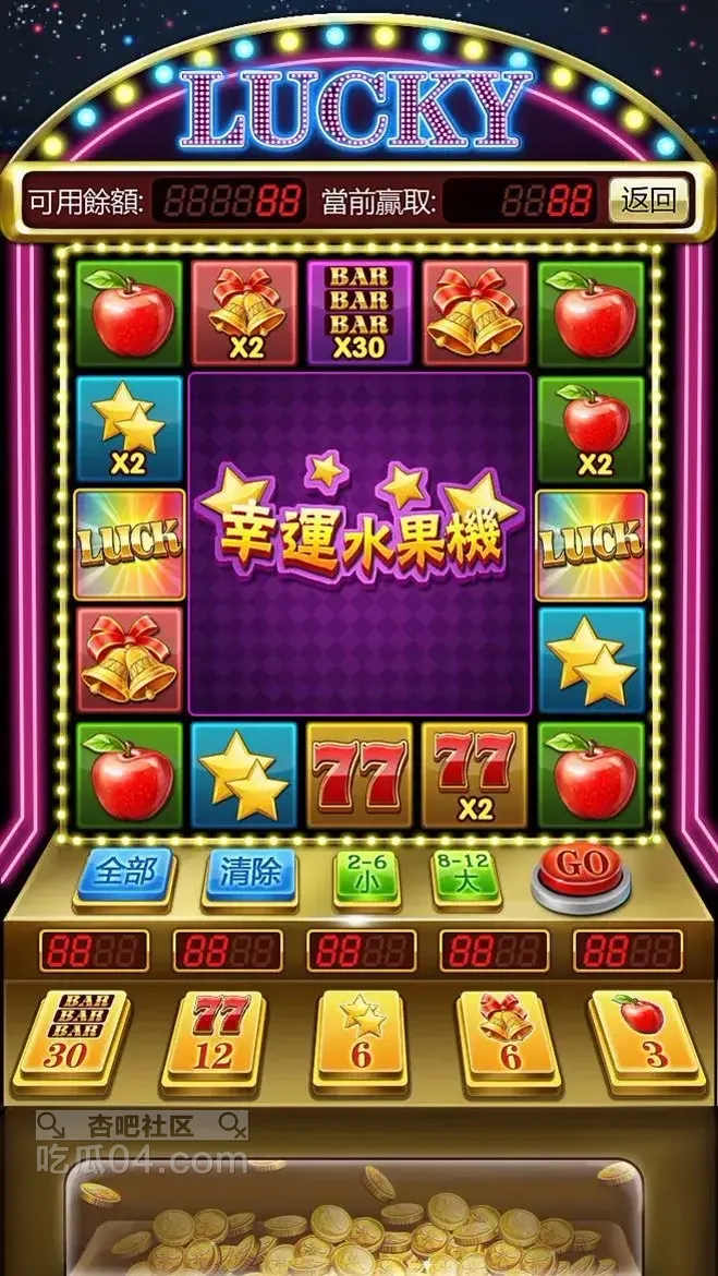 老虎机设计的原理是3列同样的东西排成一排为胜(当然,也可能是打平)。所以,您在点按钮之前,先排列出您心中期望的理想的图形,再按按钮,以期得到理想的排列结果。